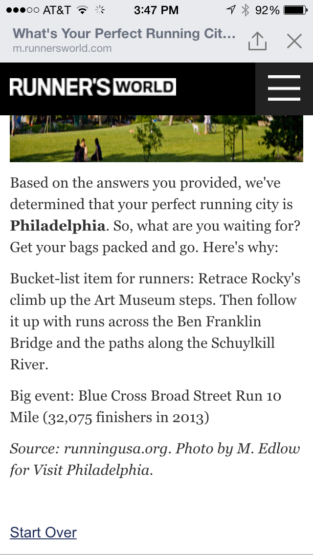 So, I will spend the rest of the week trying to cram 9 days of work into 3 (I am off beginning on Thursday and will not come back until after Thanksgiving). I will spend my free time trying to pack for 3 people (Mike is old enough to pack his own things) and doing laundry for 4. According to Dimity’s schedule, there is also some running to fit in this week. I have to finish my coding homework. I have to feed my family, carb load and find someone to watch the dog while we are gone. I also have to try to sleep and not lose my mind. Pandora just played The Streets of Philadelphia and I took this quiz on Runner’s World on Friday and got this answer as my ideal running city. Not even making this up.