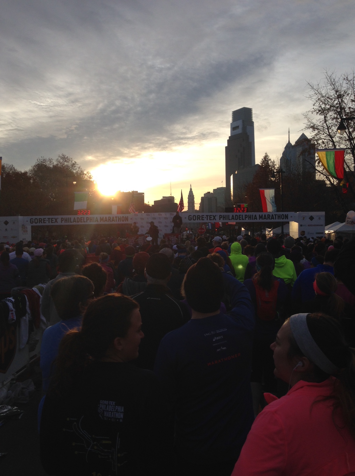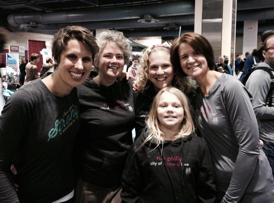 All day Saturday I was feeling really nervous. Saturday night, we had an AMR dinner at a nice Italian restaurant in Center City. I met many of the women who are a part of AMR. I also met Nicole, who I had been talking to on social media, who also runs for Oiselle. When I got back to the hotel on Saturday night, I felt very calm. For some reason the nerves were gone and I was really ready to run the race. I laid out all of my gear and pinned on my bib. We all fell asleep pretty early and, before I knew it, my alarm was sounding at 5:15 AM. Carly woke right up (a rarity) to head down to the lobby with her bike. The plan was for Carly and Dimity to ride the course on bikes to pop up along the route for support. Dimity and Carly had made signs on Friday night and I was looking forward to seeing them.