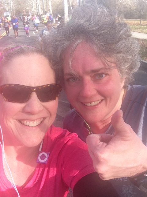 Carly, Jo and Dimity were waiting at mile 13.5 and Jo jumped in with me. We did our intervals and moved right along. These miles were kind of a blur. We ran past the river on the beautiful course. This was my first marathon but I have run a lot of races and I have to say, this was an amazing course. Flat, beautiful views, great crowds. I highly recommend it. I cannot describe the feeling of being in the second half of a marathon. At around mile 15, my left IT band and knee started to get a little stiff. I am really not surprised it decided to give me trouble. I was expecting it. Ever since my speedy Raleigh City of Oaks relay race on November 1, my ITB has been unhappy. Out on that course, at the end of my 5 mile run, it seized up, something that had never happened before – every run after that over 10 miles it got really cranky. I knew I was kind of wounded going into this race with the tendonitis in my left soleus, my cranky left ITB and my right SI joint discomfort. These nagging things, though, were not enough to make me not do this. I just figured they would make the last miles of the marathon more painful than I would want them to be. I was right. What I did not expect is that they would make me have to walk so much.