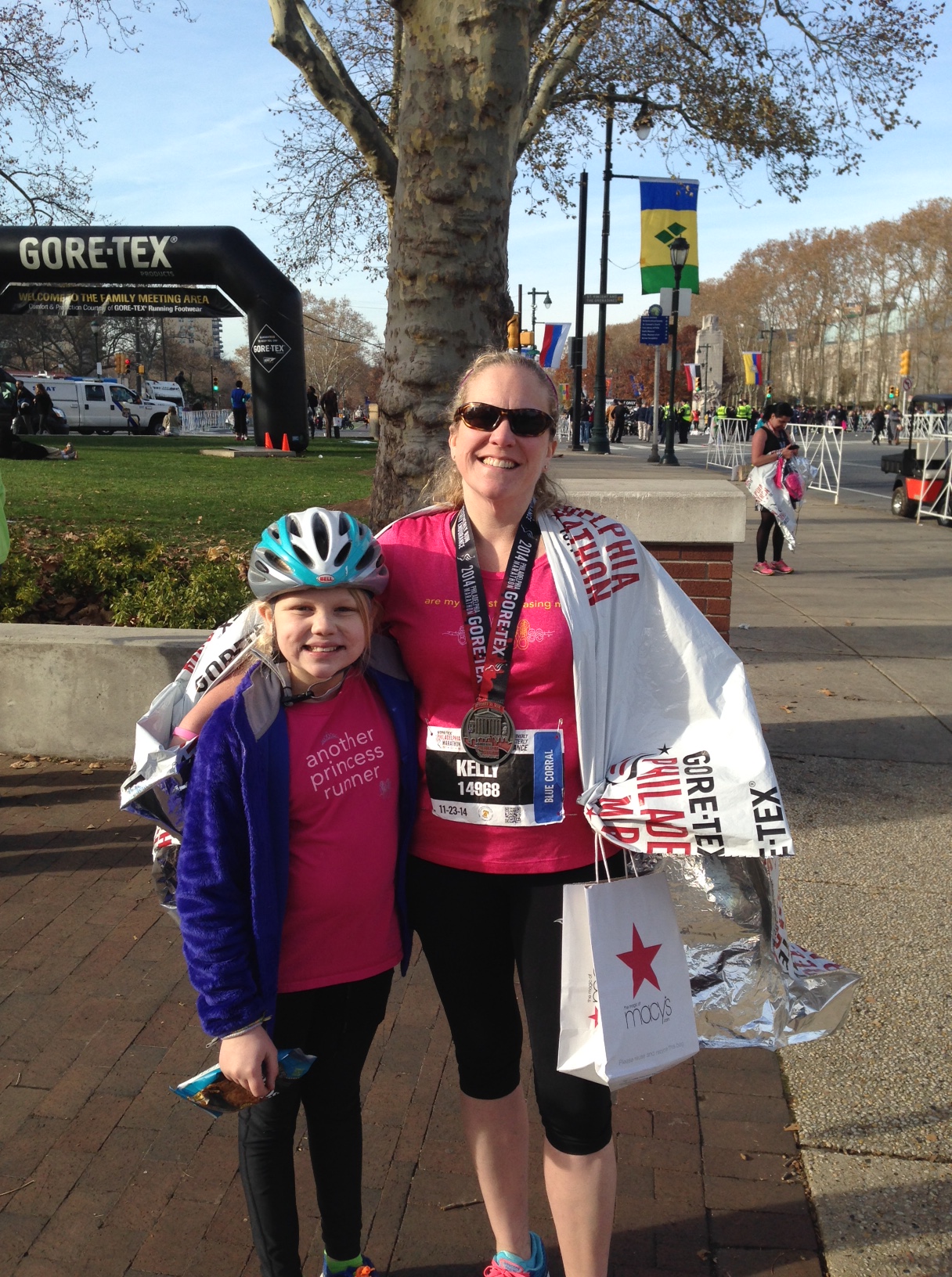 Sarah, Adrienne and I left the other folks in the lobby and headed over to the start. There were so many runners! I have never run a race this large – even the Disney Princess was not this big. It took a while for us to get back to the Blue Corral since it was the last one. We met up with mother runner, Laura, who had loaned Dimity her husband’s bike to ride during the race. We started right by the Rocky statue at the art museum, a nice touch. The corrals were well organized and the waves started right on time. Mayor Nutter released all the corrals except our corral, which was released by the Governor-elect, who told us we were “the best people in America”. We all laughed at that and it became a joke we reused many times during the first half of the race.